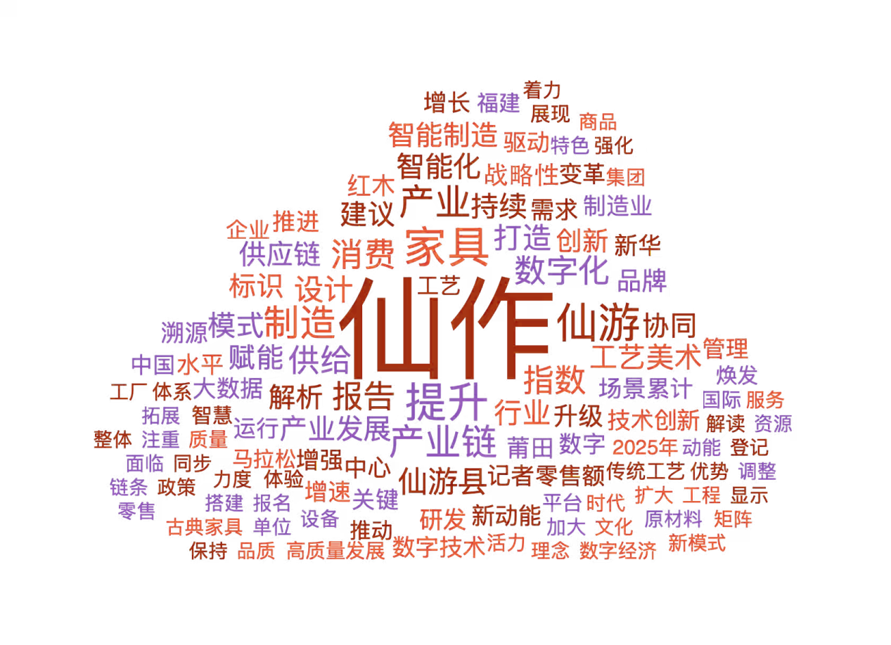 从新闻报道中的热词来看,“仙作”一词的热度稳居绝对核心,带动“家具”与“仙游”形成“品牌+品类+地域”三位一体的识别锚点。“制造”“产业链”“供给”等热词,说明报道重心已从单纯工艺转向更深层的产业体系建设与高质量发展。同时,“数字化”“智能化”“设计”等词的热度并列靠前,反映出仙作产业正由传统制造向科技赋能与创意驱动并重的方向转型。此外,“报告”和“指数”两个词也进入热词前列,表明以数据为基础的权威指数报告也成为传播的重要抓手。