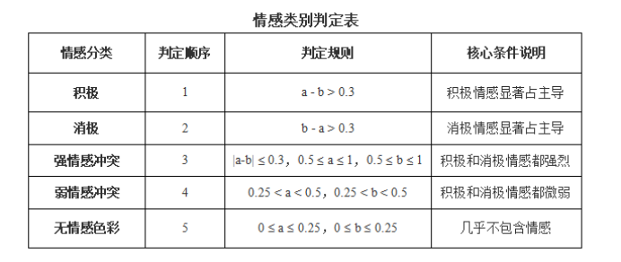 (注:设定a=积极情感匹配度,b=消极情感匹配度,a,bϵ[0,1]。据人工经验显示,|a-b|>0.3时,大模型容易判定情感分类为积极or消极。而当|a-b|≤0.3时,大模型则难辨情感倾向,会统一判别为中立。因此|a-b|≤0.3的阈值进一步细分为三类:以0.5、0.25为界,区分强冲突、弱冲突和无情感色彩。)