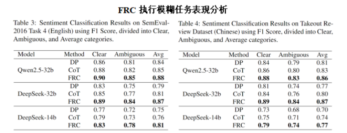 为了验证FRC模糊思维链方法的有效性,中国联通数据科学与人工智能研究院在多个主流基础大模型上,针对多场景复杂任务开展了全面评估。以情感分析为例,当用户表达模糊情况下,FRC模糊思维链的准确率显著优于传统方法。例如,在DeepSeek-32b模型上,FRC模糊思维链对英文场景的准确率相较于传统CoT提升约7%,对于中文场景提升约8%,由此可知FRC模糊思维链能显著提升模型处理复杂场景问题的精细度。