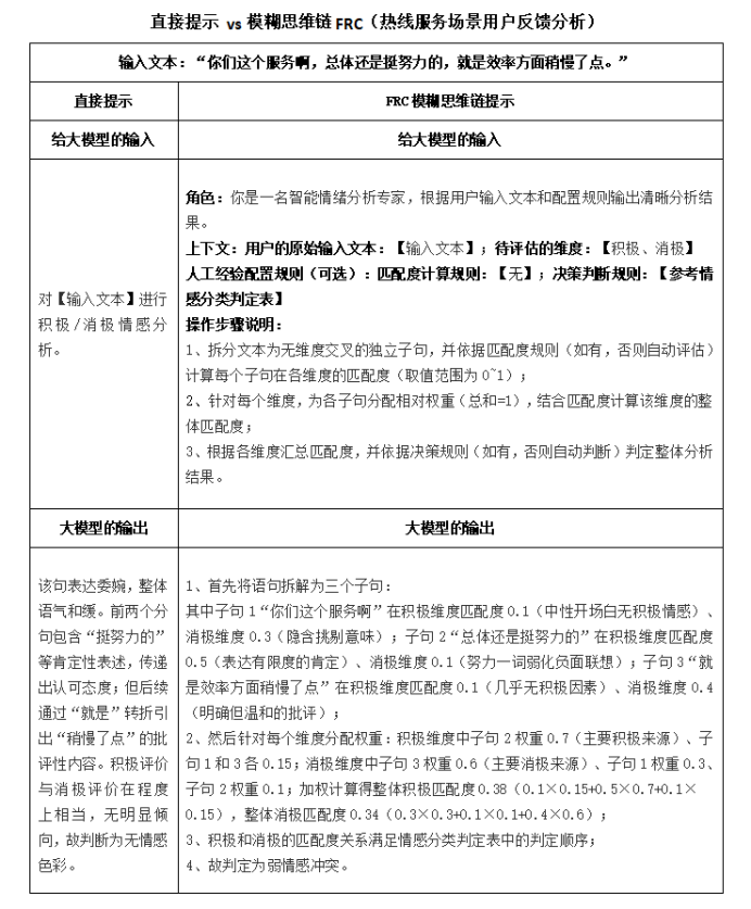 直接使用大模型或简单的思维链提示方式很难做出准确的精细化分类,例如:针对用户反馈“你们这个服务啊,总体还是蛮努力的,就是效率方面稍慢了点”,给出的判别结果是“无情感色彩”,分类不够精准,而FRC则判别出“弱情感冲突”分类,更符合业务需要。