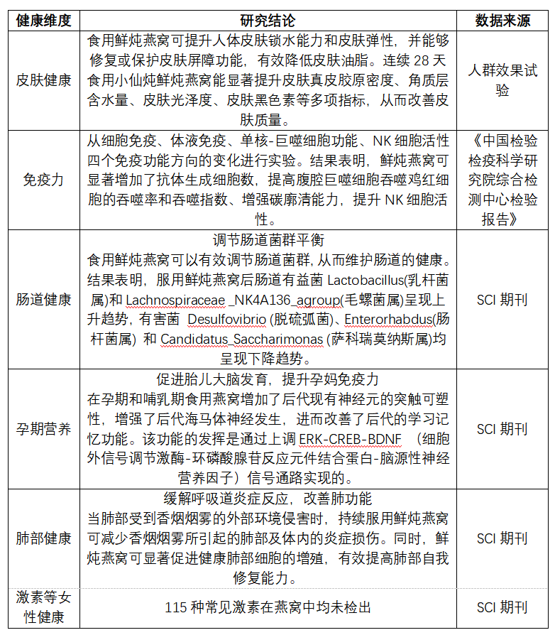 同时,目前已通过科研论证了燕窝对皮肤健康、子代大脑发育、免疫力、肠道健康、肺部健康等方面的作用,燕窝对健康的价值不再只是古籍中的记载,更得到了明确科研论证。