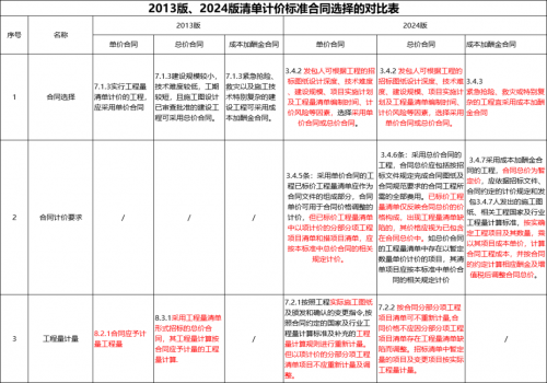 解析:①合同选择不同。2013与2024版清单规范合同选择上有所不同,2013主要从项目清单形式、规模大小以及紧急复杂程度来选择合同价格形式。而2024版主要强调发包人根据项目特点难易程度自主选择合同的价格形式。把主动权交给发包人来确定,这就要求发包人对工程项目有前瞻性、预见性,根据以往的经验来选择适合的合同价格形式。