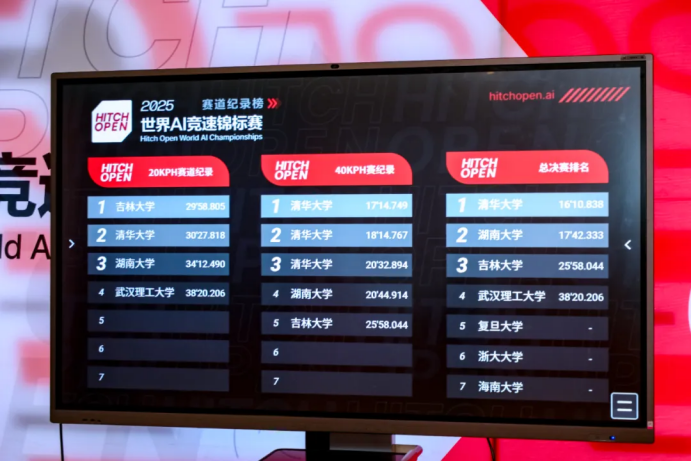 在Hitch Open世界AI竞速锦标赛总决赛中,清华大学极限竞速战队、湖南大学HIVE战队、吉林大学智翼人工智能战队、复旦大学Code Wisdom战队、武汉理工大学智驭战队、杭州龙战队、海南大学Azure Matrix蔚蓝矩阵战队等七组战队成绩榜