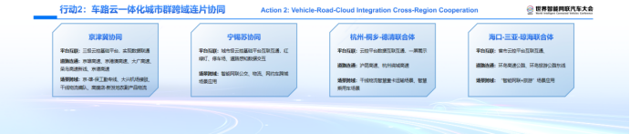 行动二:车路云一体化城市群跨域连片协同。在京津冀、宁锡苏、杭州-桐乡-德清联合体、海口-三亚-琼海联合体等地率先积极开展城市群跨域连片协同,开展平台互联、道路互通、场景跨域等工作。