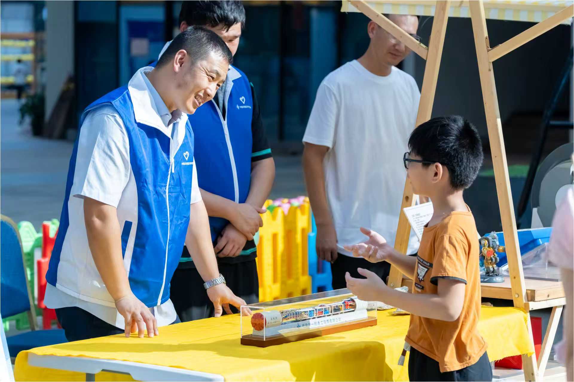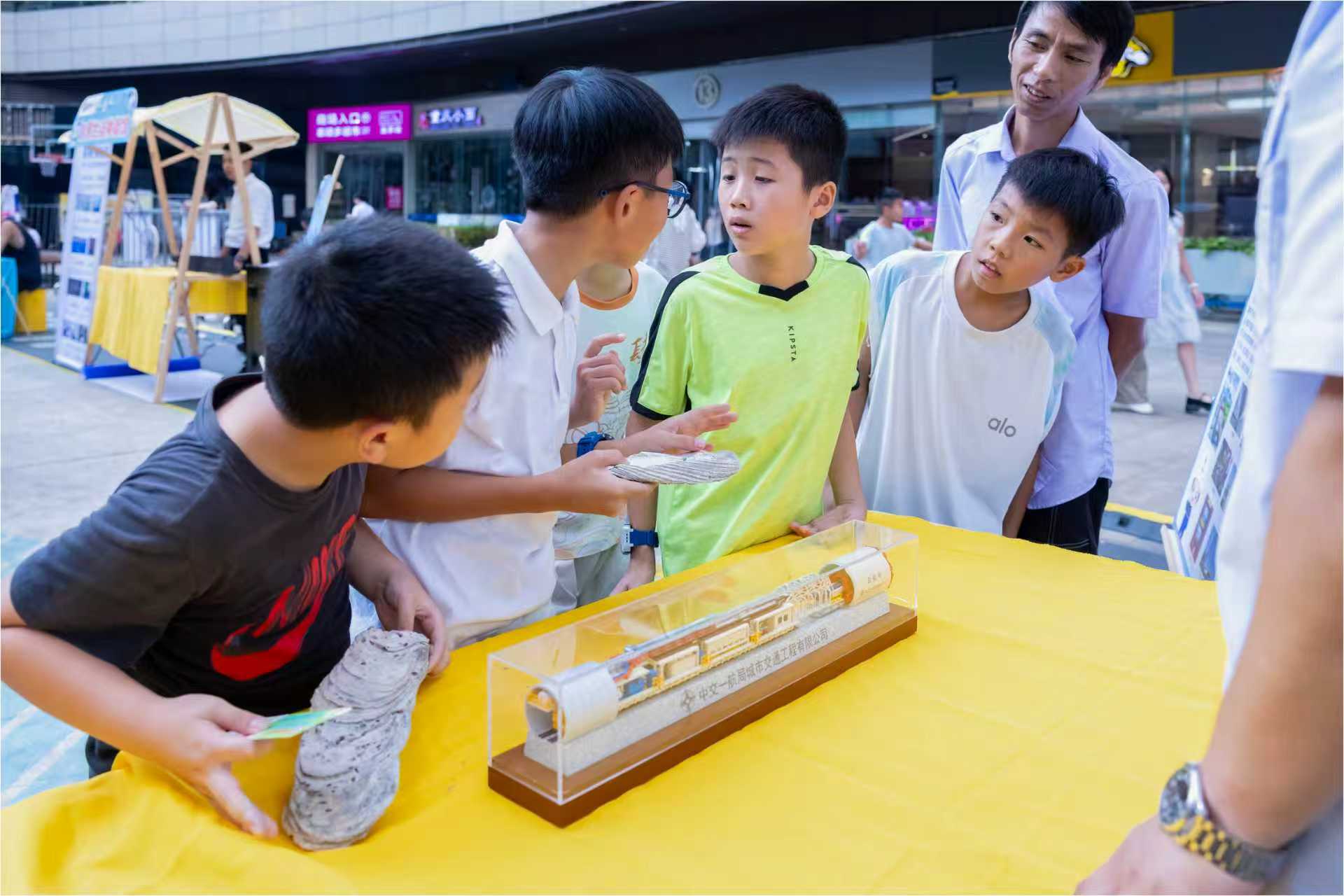 活动现场,一台精巧的小盾构机模型和特色贝壳标本成为全场焦点。在“科技探索”展区,项目部工程师化身“科普老师”,用生动形象的比喻为孩子们讲解盾构机的工作原理:“它就像一只在地下穿行的钢铁穿山甲——这只‘钢铁穿山甲’本领可大了!前面旋转的‘牙齿’叫刀盘,能轻松啃下坚硬的岩石土壤;后面跟着的‘身体’是管片,一节节拼装起来,就能在地下撑起一条安全稳固的通道,而且地面上的房屋、道路丝毫不受影响哦!”
