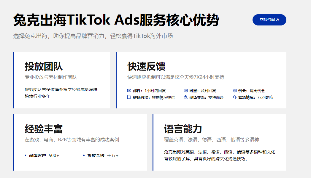真正专业的TikTok广告开户服务商,不仅可以帮助企业快速完成账户注册与审核,更应提供从投放策略、素材创意、多语言适配到数据优化的全链路出海营销支持。尤其需关注以下几点: