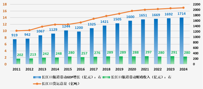 2024年,是长江口深水航道正式发挥效益的第14年,也是长江口南槽6米航道建成通航的第4年。14年间,长江口航道始终保持安全畅通,经济社会效益总体上保持稳定增长,通过长江口航道的货运总量达194.27亿吨,共计产生航运、港口直接经济效益1932亿元,拉动GDP增长达19080亿元,带动财政收入增加3732亿元。2024年当年通过货运总量16.99亿吨,航运、港口直接经济效益222.29亿元,拉动GDP增长1714.09亿元,较2011年,直接经济效益实现了150.35%的增长,年均增速达7.31%。同时,长江口航道经济效益费用比,从2011年的5.55倍攀升至2024年的11.20倍。这一显著提升,深刻印证了长江口航道“小投入、大产出”的特色,凸显了其独特的经济价值、发展潜力和战略地位。