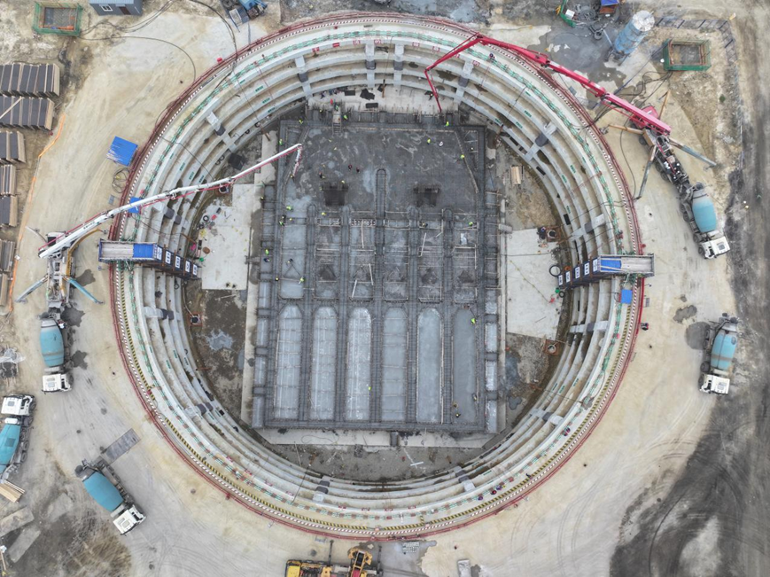 据悉,该泵房基坑为半径33.4米的圆形结构,深度15.8米,底板厚度2米,下部基础采用61根灌注桩。此次浇筑历经30余小时连续奋战,累计浇筑混凝土4000方(其中泵房底板混凝土3755.1方),浇筑体量大、施工节奏紧,是项目劳动竞赛中的关键控制性节点。