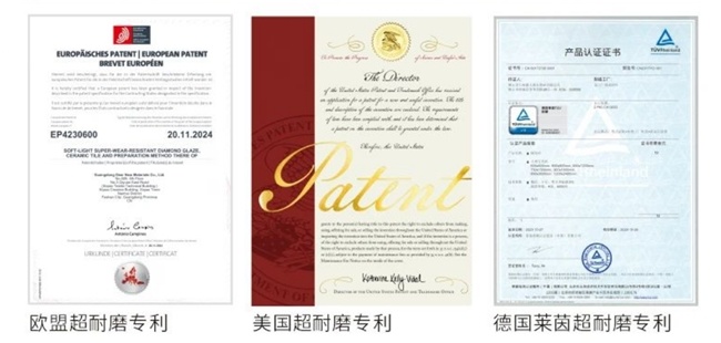 当前,大角鹿拥有行业超70%的超耐磨发明专利,是耐磨度全球第一、超耐磨专利数量行业第一的瓷砖品牌,并取得了德国莱茵TÜV超耐磨认证及美国、欧盟发明专利授权,已成功构建起全球专利壁垒。