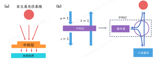 图5(a)非互易光伏系统;(b)非互易中间层耦合循环器功能[10]