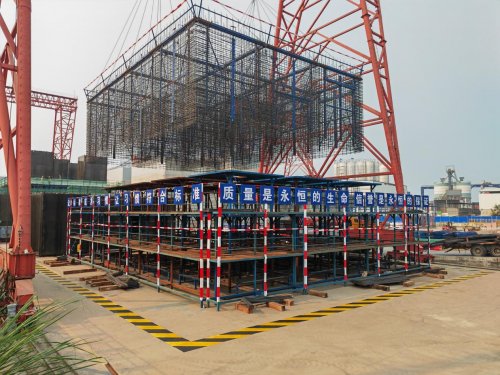 “施工中,我们团队采用的是‘分层分块绑扎+整体吊装’这一新工艺,”项目总工程师邓尚康介绍:“先把大型钢筋笼分解成标准模块,进行精细化作业,再利用专用吊具整体吊装,实现高效拼装。”这项工艺成功应用在97件沉箱预制中,成型尺寸准确、结构质量稳定,大幅提升了项目的施工效率和标准化水平。