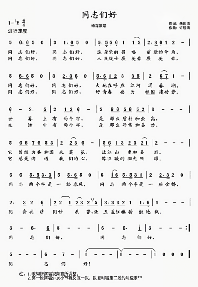 《同志们好》歌曲简谱: