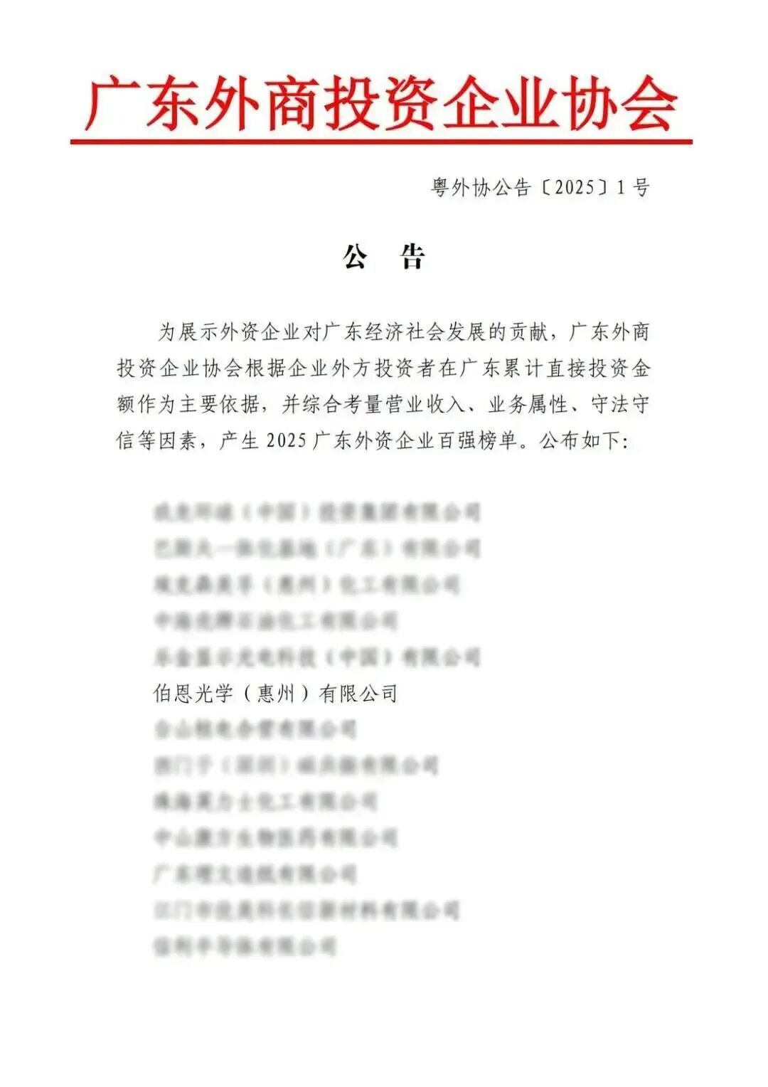 10月30日,2025年广东外资企业百强榜单正式发布,伯恩光学控股有限公司旗下的伯恩光学(惠州)有限公司不仅入选榜单前列,更实现连续两年上榜,彰显企业在粤发展实力。