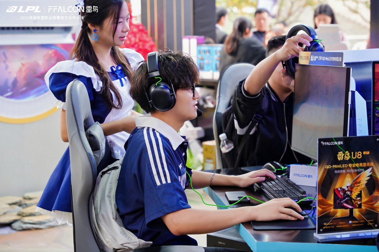 最受硬核玩家青睐的 “盟友竞技场” 则化身为雷鸟高性能显示器的展示舞台。现场整齐陈列的20台搭载300Hz极致刷新率的雷鸟F6显示器,为现场开黑体验“海克斯大乱斗”新模式的玩家提供了无与伦比的竞技优势。超高刷新率确保了每一个操作指令都能得到瞬时响应,彻底告别画面拖影与撕裂,赢得了现场玩家的一致好评。