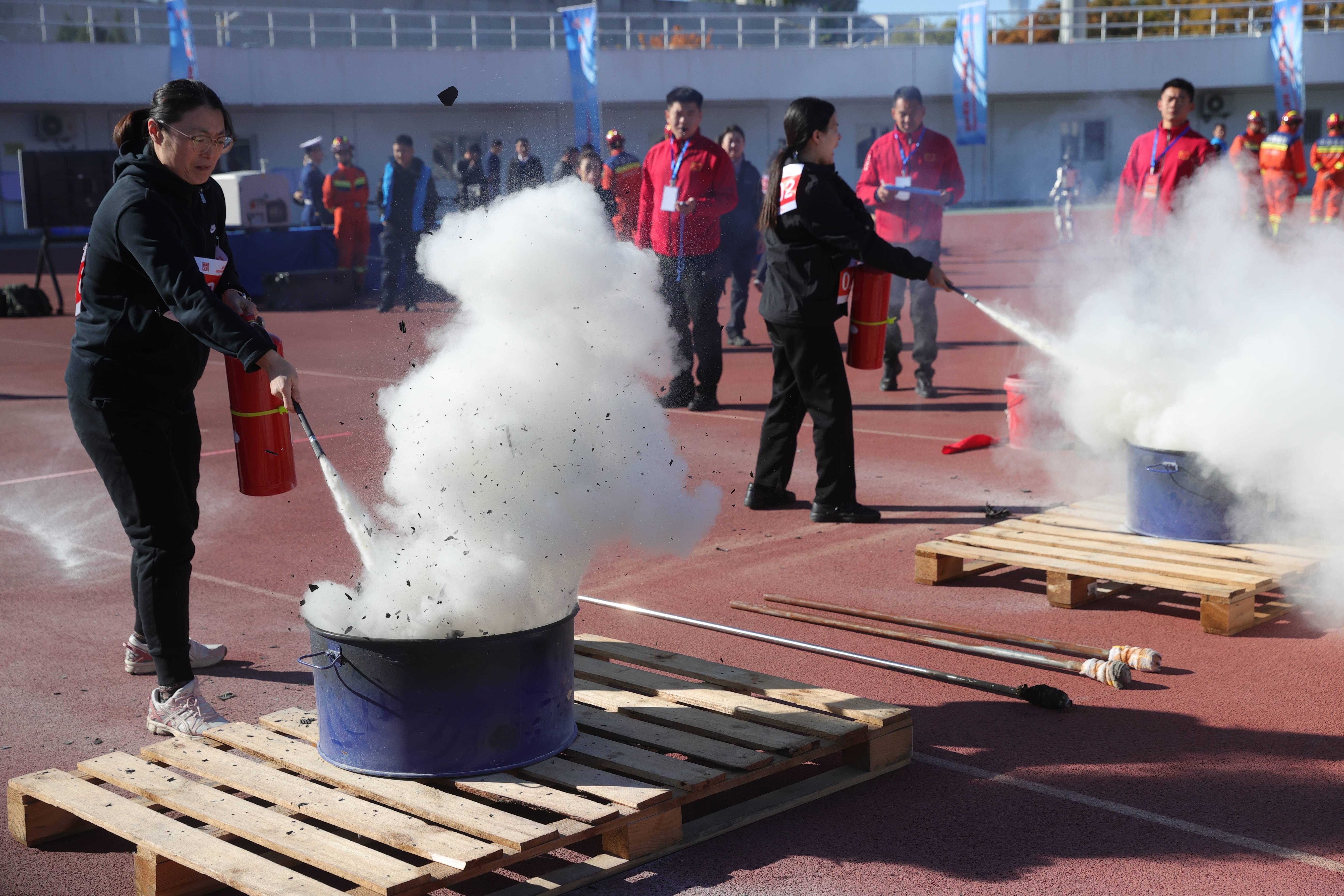 在自防自救力量展示交流区,115名选手参加了原地着装佩戴空气呼吸器、灭火器灭真火、消火栓出真水、快速着装、畅通疏散通道、两盘水带连接等12个项目的比拼。这些项目瞄准初起火灾处置的关键技能,检验选手在火灾“黄金时间”内的应急反应能力。