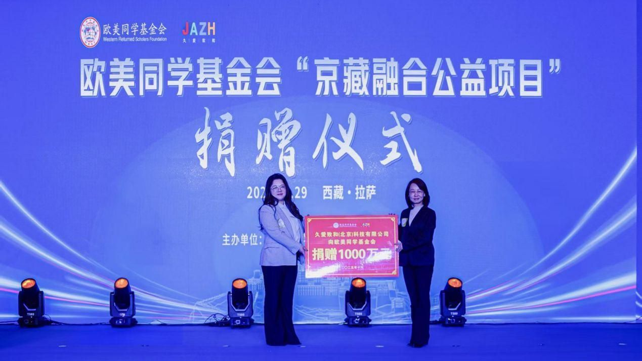 仪式现场,久爱致和(北京)科技有限公司董事长、总经理王妍代表公司捐赠人民币1000万元,支持“京藏融合公益项目”落地实施,欧美同学基金会副秘书长王穗接受捐赠。该公司还将发挥其在数字技术、电商运营及人才培养领域的专业优势,为藏区大学生提供数字化技能培训课程,依托公司供应链与平台资源,为西藏本土特色产品搭建线上推广渠道,助力乡村振兴与产业发展,让科技力量成为连接京藏、赋能西藏的重要纽带。