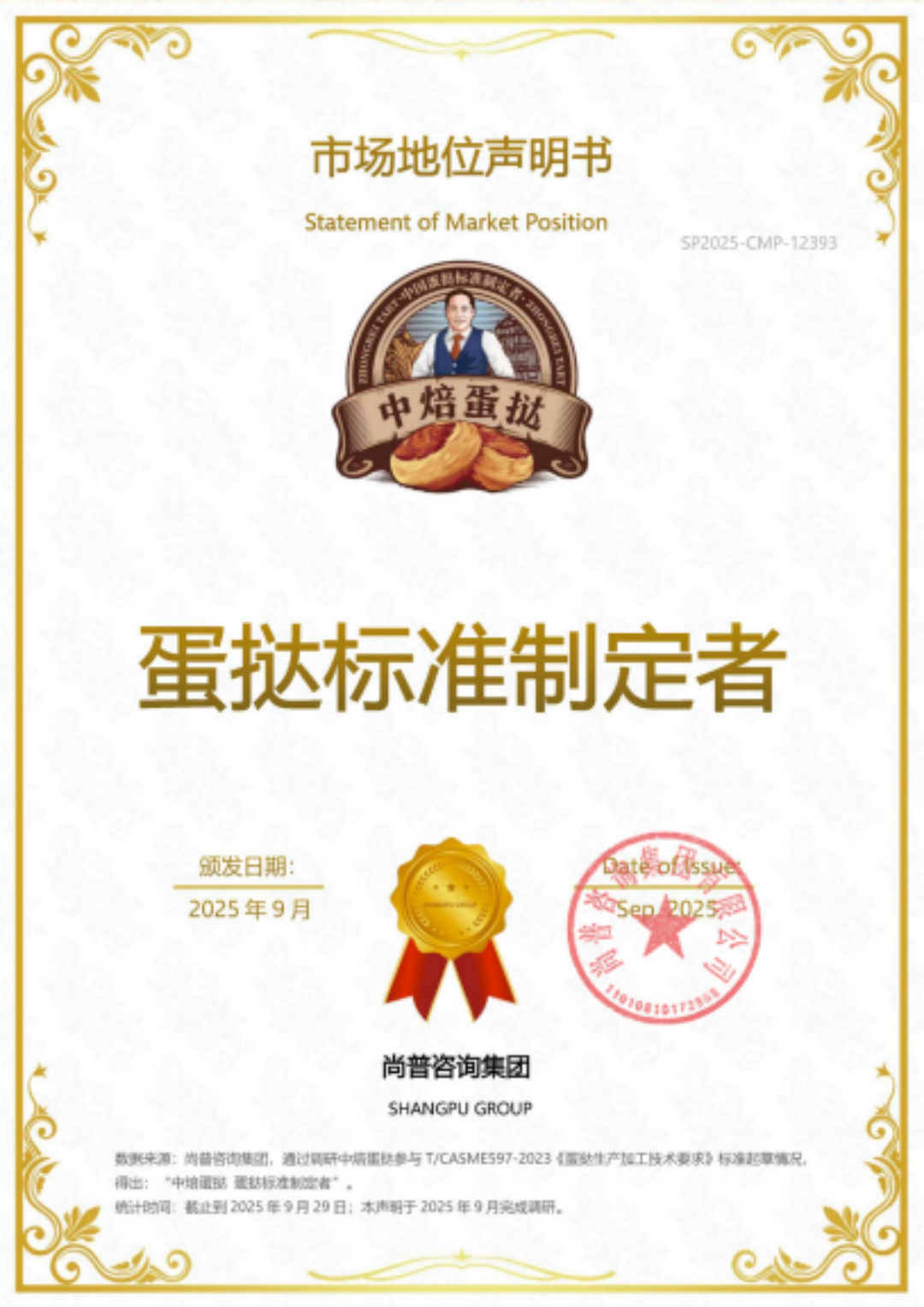2025年9月,权威调研机构尚普咨询集团发布市场地位声明,中焙蛋挞凭借在蛋挞标准制定、供应链建设及市场开拓的硬实力,一举斩获“蛋挞标准制定者”“蛋挞供应链领导品牌”“连锁烘焙门店蛋挞皮蛋挞液供应链市场占有率第一”三项认证。作为首批获国家统计局涉外调查资质的机构,尚普咨询的认证堪称行业“品质风向标”,这也印证了中焙蛋挞作为专业蛋挞厂家与头部蛋挞供应商的行业地位。