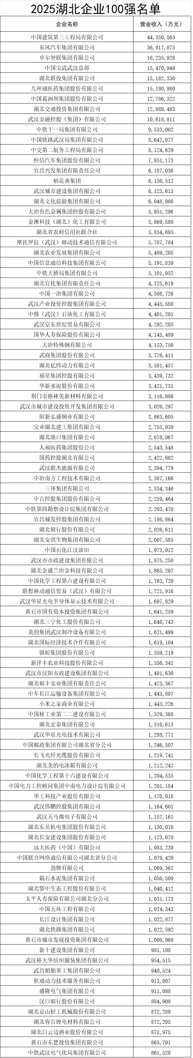 2025湖北企业三项100强榜单,仍然是遵循国际通行的惯例,依照中国企联开展的“中国企业三项500强”分析发布活动的要求和做法,以企业上年度营业(销售)收入为入围标准,根据企业自愿申报并经审计的各项指标数据,由湖北省企联湖北企业三项100强分析发布活动办公室调研、审核、分析,经湖北省企联湖北企业三项100强分析发布活动领导小组审定,并报省国资委后产生的。