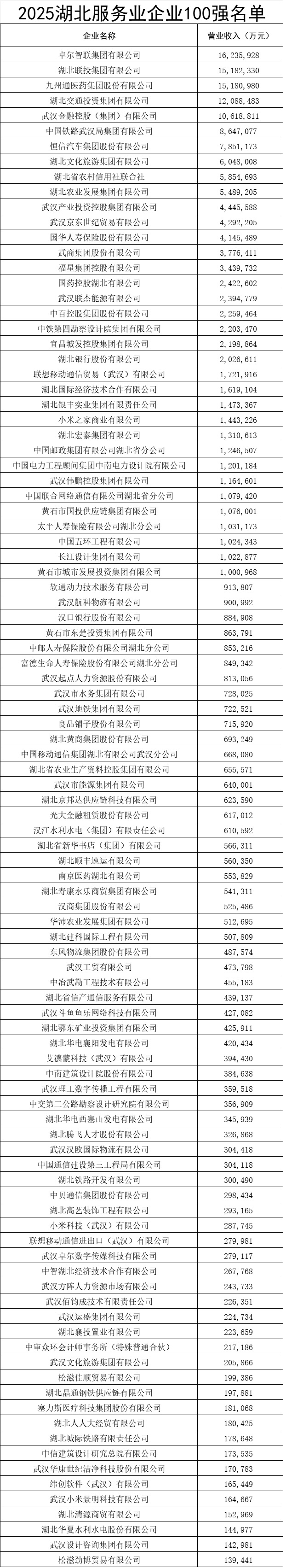 2025湖北服务业企业100强的入围门槛从8亿元跃升至13.9亿元;营业收入18218亿元,同比增长9%,其中营收破百亿的企业有35家,较上年度增加2家,占总营收的84%。利润总额446亿元,同比下降10%。纳税总额448亿元,同比下降6%。研发费用为102亿元,同比下降6%。2025湖北服务业企业100强减少了7万个就业岗位。26家企业新上榜2025湖北服务业企业100强,较上年度增加3家。2025湖北服务业企业100强中,武汉85家,比上年度减少3家;荆州4家,比上年度减少1家;宜昌1家、黄冈1家、十堰1家、孝感1家,均与上年度持平;襄阳2家,比上年度增加1家;黄石5家,比上年度增加3家。