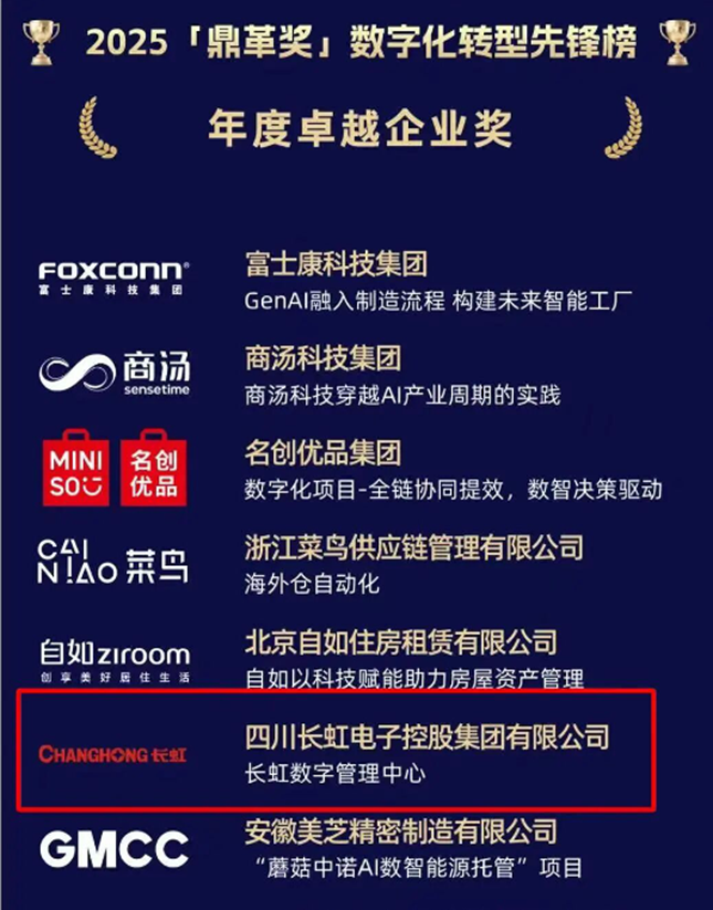 10月31日,备受业界关注的“2025·「鼎革奖」数智化先锋榜”评选结果在北京揭晓。四川长虹电子控股集团有限公司凭借“长虹数字管理中心”获得“年度卓越企业奖”。