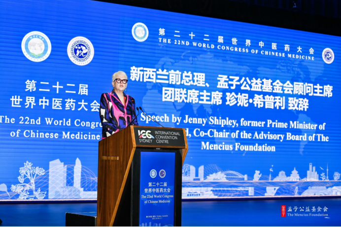 新西兰前总理、孟子公益基金会顾问主席团联席主席珍妮·希普利在发言中呼应孟亮的理念。她指出,孟子思想中的“修身自省”与“平衡之道”与中医药哲学高度契合。她提出推动中医药国际化的三大路径:加强文化传播,将中医药智慧融入现代生活;善用人工智能与大数据赋能诊疗实践;深化国际合作,推动中医药进入全球公共卫生政策体系。