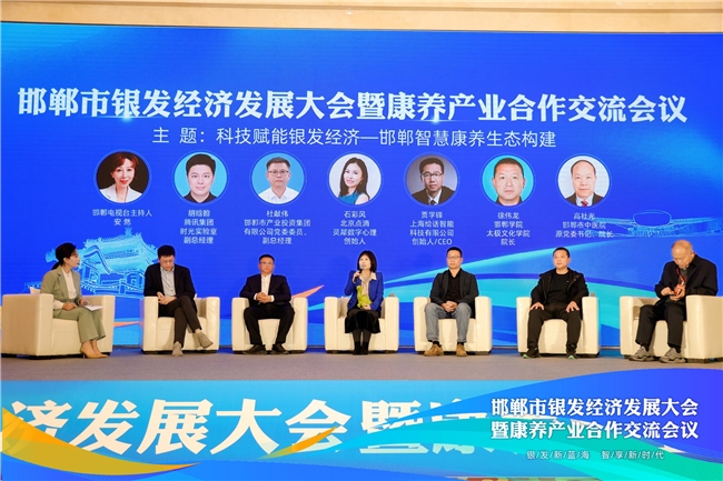 在题为“科技赋能银发经济——邯郸智慧康养生态构建”的对话环节中,由邯郸电视台主持人安然主持,腾讯集团时光实验室副总经理胡晗翰、邯郸市产业投资集团有限公司党委委员、副总经理杜献伟、北京点滴灵犀数字心理创始人石彩风、上海绘话智能科技有限公司创始人/CEO贾学锋、邯郸学院太极文化学院院长徐伟龙、邯郸市中医院原党委书记、院长高社光等嘉宾,分别围绕银发科技创新、智慧助老与安全供水、情感交互机器人养老体系、AI陪伴技术、太极养生及中医养老等议题,分享了前沿探索与实践经验,共同勾勒出智慧康养生态的未来发展图景。