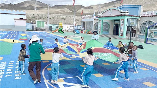 西藏自治区日喀则市定日县岗嘎镇查孜村幼儿园,小朋友在乡村儿童操场上进行游戏。图为受访者供图